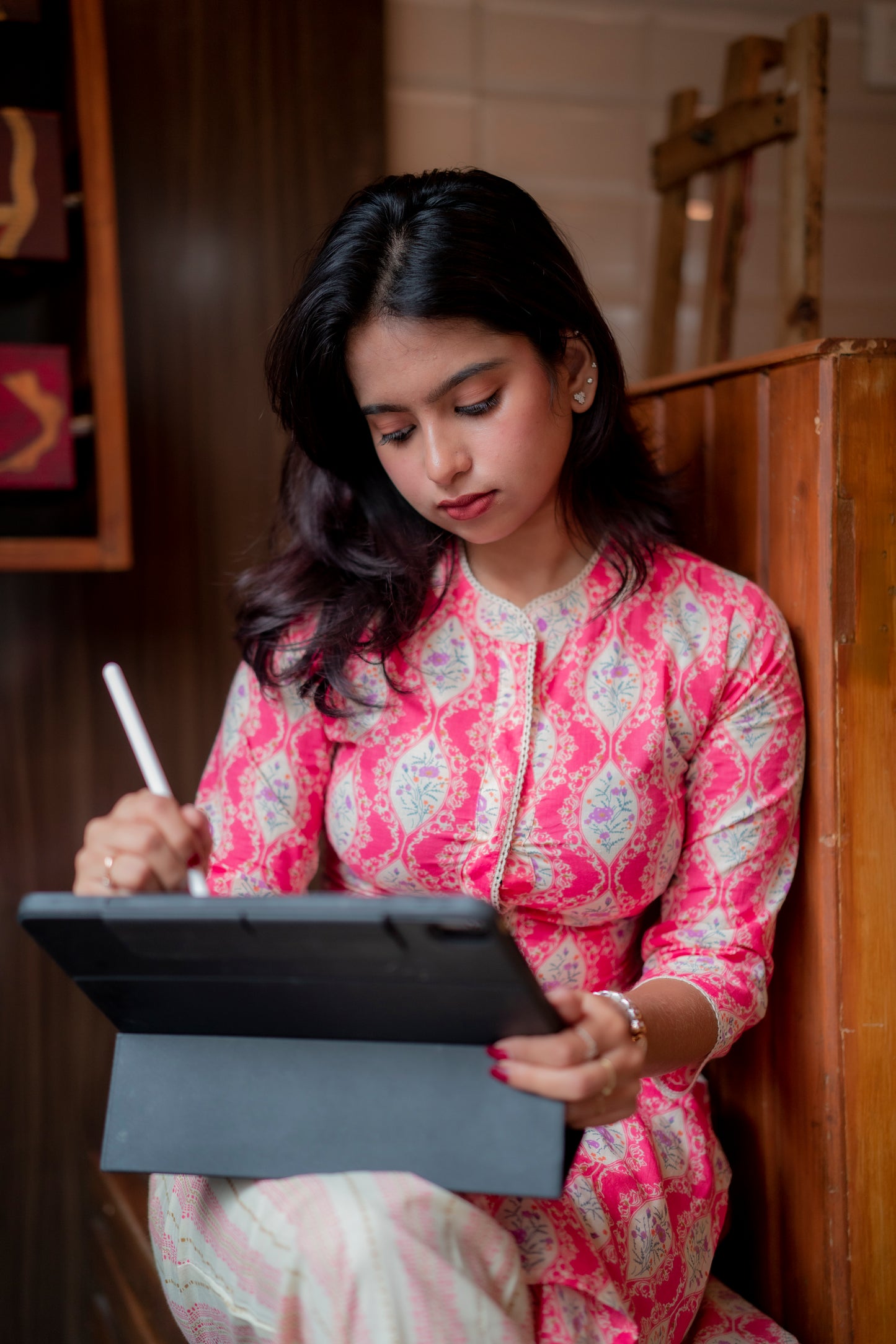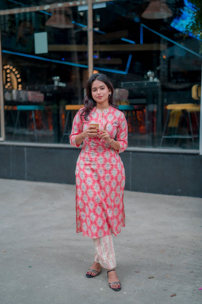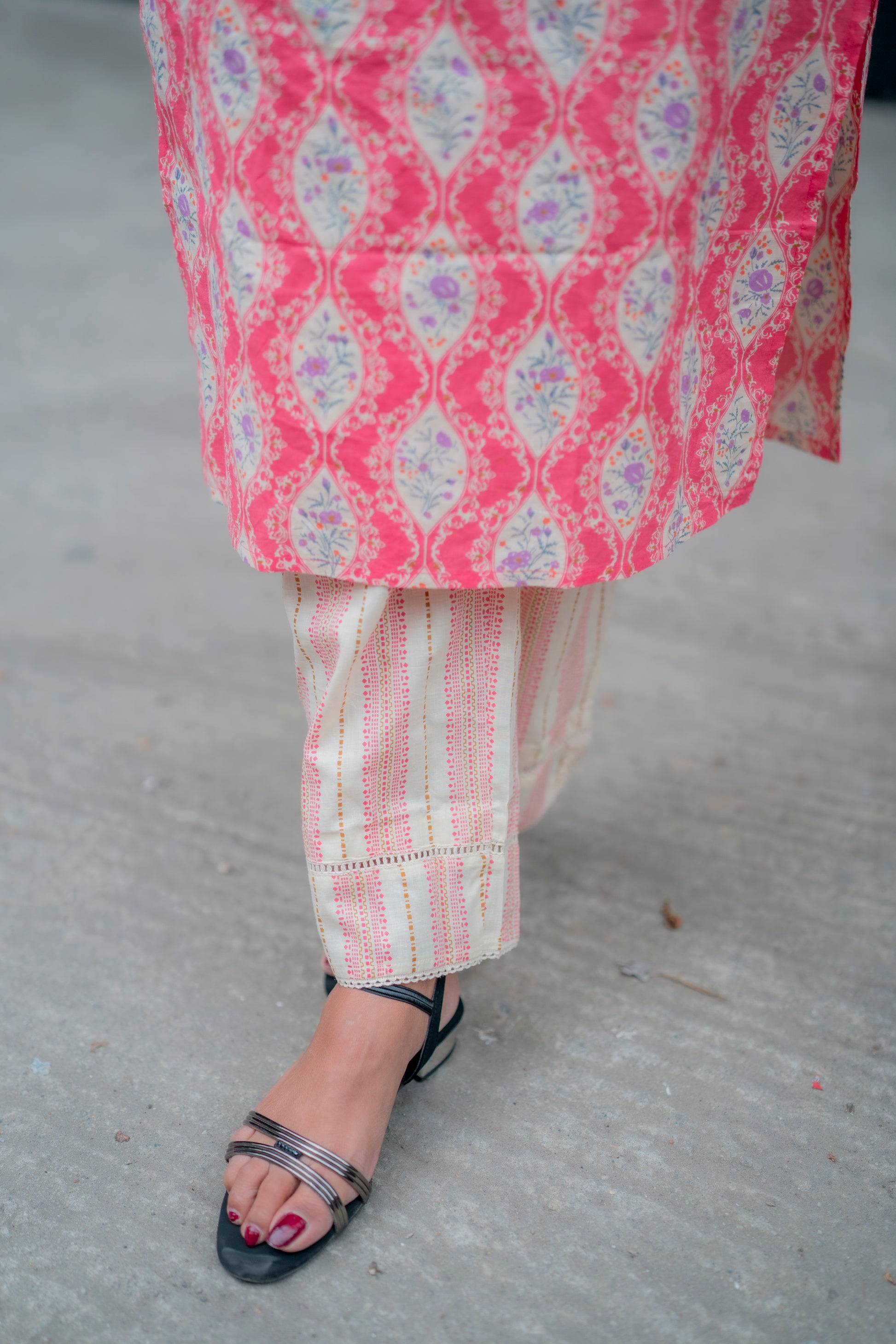Rock any event with this stylish ensemble, featuring traditional craftsmanship and contemporary details. Cotton handblock kurta boasts a smart collar with hidden openable buttons, functional pockets, and lace highlights on pants hemline.
