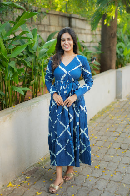 Step into effortless elegance with this Indigo Shibori Cotton Maxi Dress. Hand-dyed using traditional shibori techniques, this dress features a flattering V-neckline, full-length sleeves, and a gathered waist with a detachable fabric belt for added shape. The tiered hemline adds a flowy charm, making it perfect for both casual outings and festive brunches. Made from breathable cotton, it ensures all-day comfort with style.