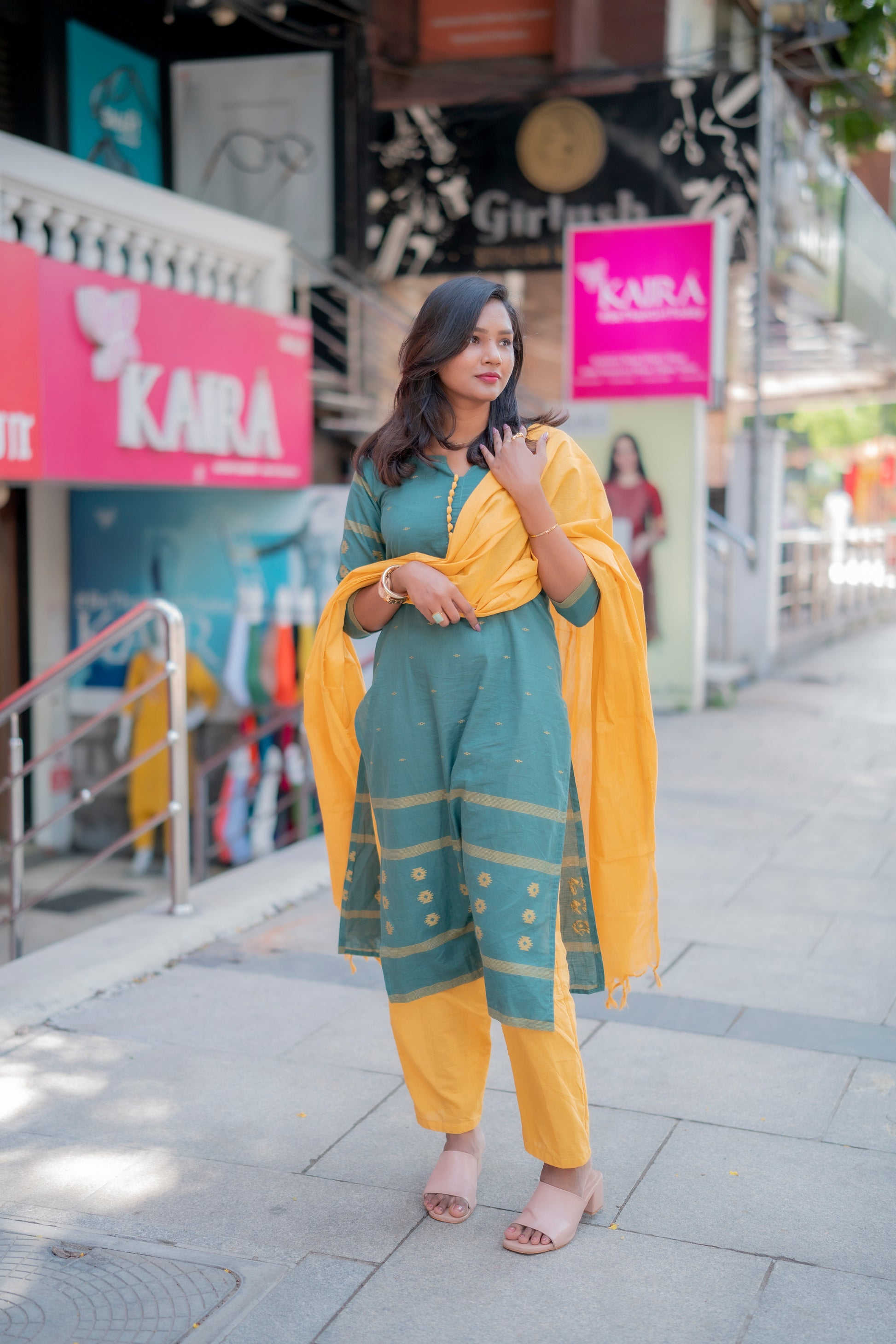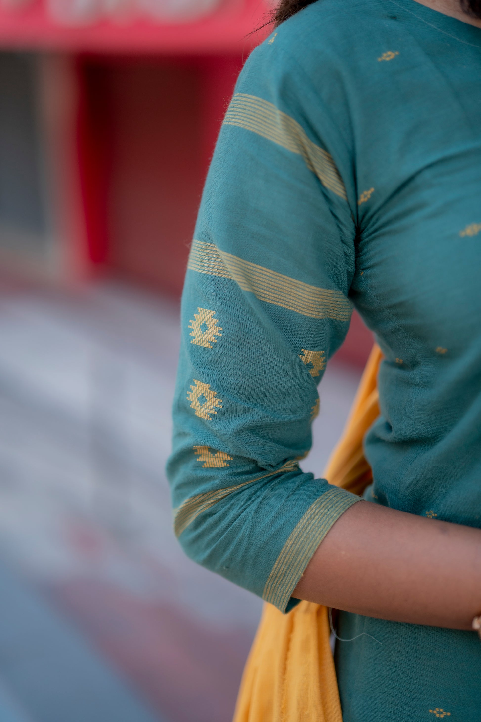 Grace meets simplicity in this beautiful teal cotton kurta set, adorned with subtle woven motifs and paired with a vibrant mustard dupatta. The kurta features a round neckline with fabric button detailing and elbow-length sleeves with traditional block-inspired patterns. Perfect for festive gatherings or casual outings, this outfit brings a touch of sunshine with its bright contrast and breathable comfort