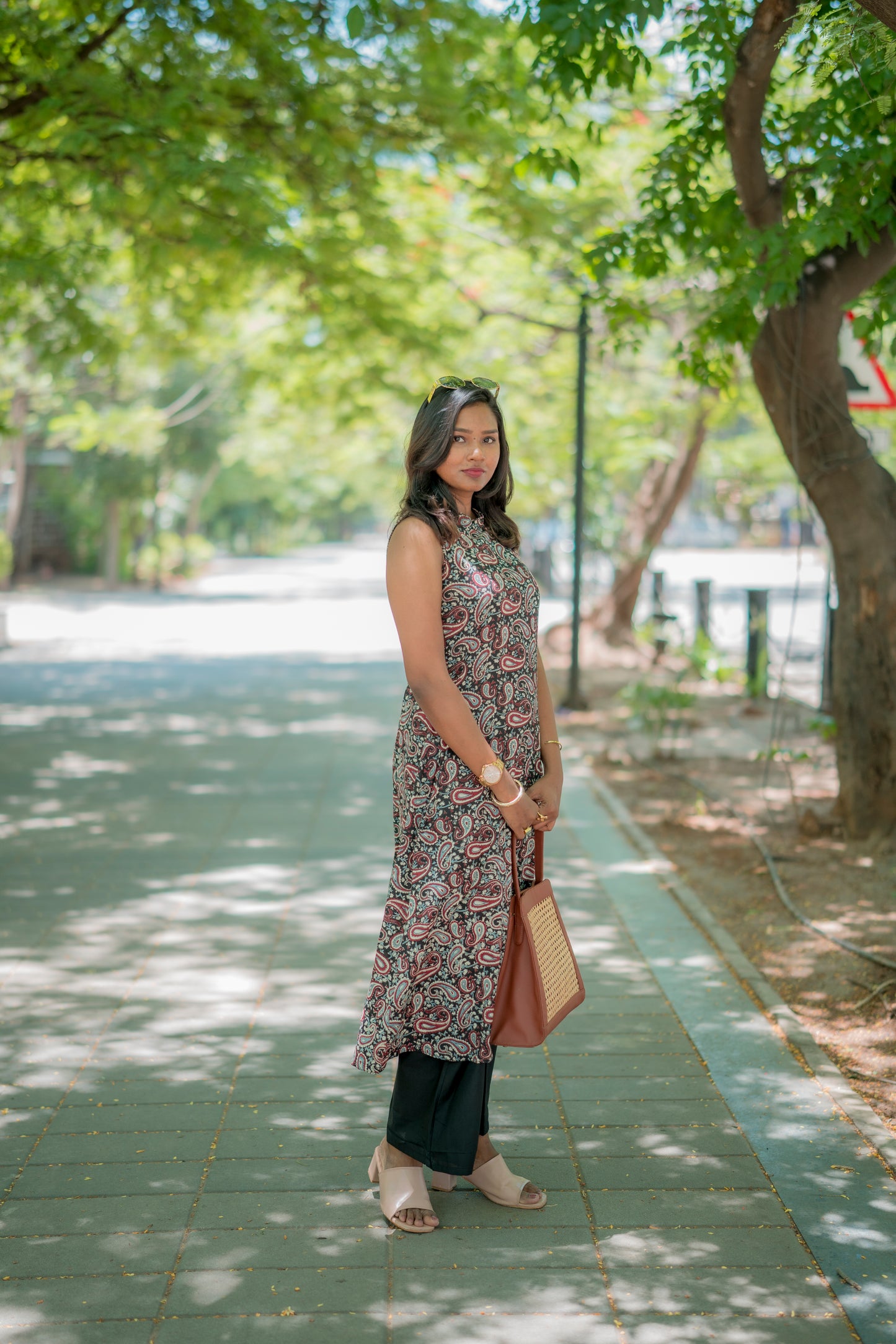 Embrace timeless charm with this sleeveless, A-line kurta adorned in a rich paisley print. Crafted from lightweight, breathable fabric, this outfit pairs perfectly with wide-legged black palazzos for a contemporary Indo-western look.